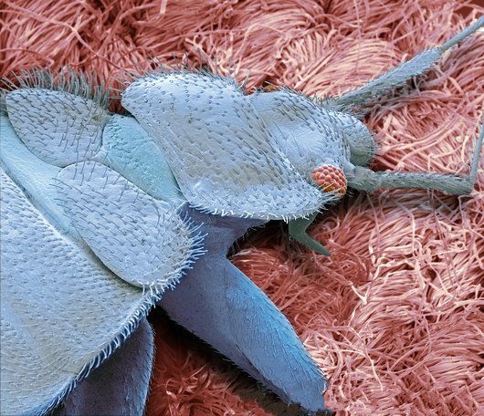 Bedbug. Coloured scanning electron micrograph (SEM) of a bedbug (Cimex sp.). Adult bedbugs’ bodies are flattened, oval, and wingless, with microscopic hairs that give them a banded appearance. They feed on the blood of warm-blood animals, including humans. Bedbugs are generally only active at night, hiding in crevices in walls and furniture and in bedding during the day. Although they do not transmit disease, their saliva can cause itchy swellings on the skin. Magnification: x15 when printed 10 centimetres wide.